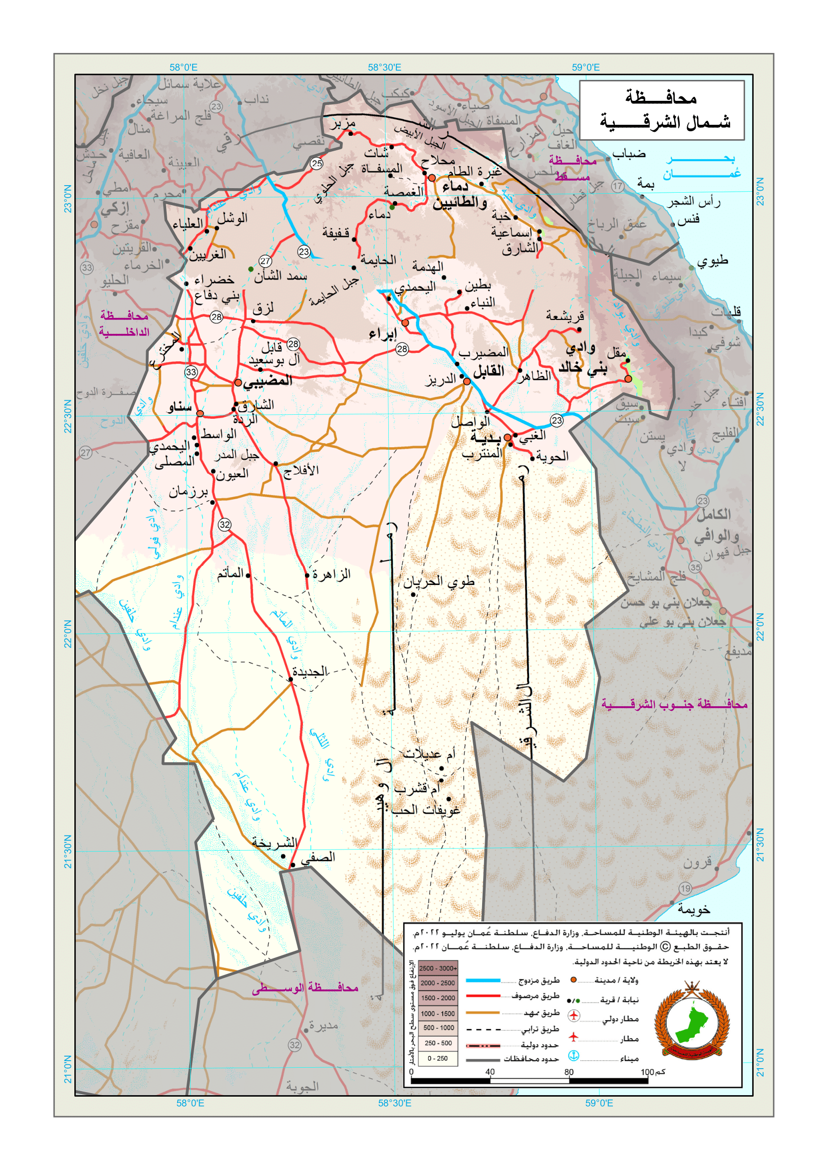 North Al Sharqiyah Governorate overlooks the interior of the eastern Al Hajar Mountains, and is connected to it from the north by Muscat Governorate, from the west by Ad Dakhiliyah Governorate, and from the east and south by South Al Sharqiyah Governorate. North Al Sharqiyah Governorate consists of seven wilayats: Ibra, Al Mudhaibi, Bidiyah, Al Qabil, Wadi Bani Khalid, Dima, At Taiyeen, and Sinaw. The governorate's center is the wilayat of Ibra. North Al Sharqiyah Governorate has enjoyed many development projects that have extended to various fields of health, education, tourism, roads, electricity, water, and others.